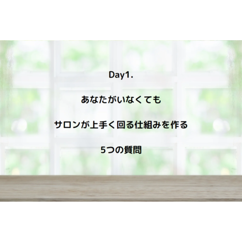 | Today⇒ Day1. あなたがいなくてもサロンが上手く回る仕組みを作る5つの質問 Day2. ポストコロナ 「頑張ったら給与が上がる」のオーナーの常識は、もはや非常識その理由とは? Day3. 飲みニューケーションなんていらない?飲み会を廃止した理由 Day4. サロンオーナーとスタッフに距離ができるから人が育つ?! 本当の意味は? Day5. オーダーメイドメニューは一切廃止その理由とは? Day6. ルールがないサロンは自由でいいサロン?ルールがあるから人が辞めずに育つ Day7. 「良いサロンは人が辞めるサロン」の本当の意味とは |